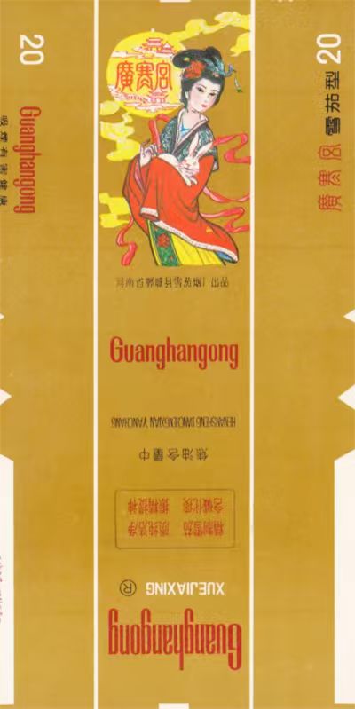 上世紀(jì)八九十年代,河南省鄲城縣雪茄煙廠出品“廣寒宮”雪茄型卷煙,煙標(biāo)設(shè)計(jì)采用暖色系配色,以醒目的紅色勾勒廣寒宮輪廓,嫦娥頭戴嬌艷的紅花和華麗的點(diǎn)翠頭飾,懷抱玉兔,眺望人間。