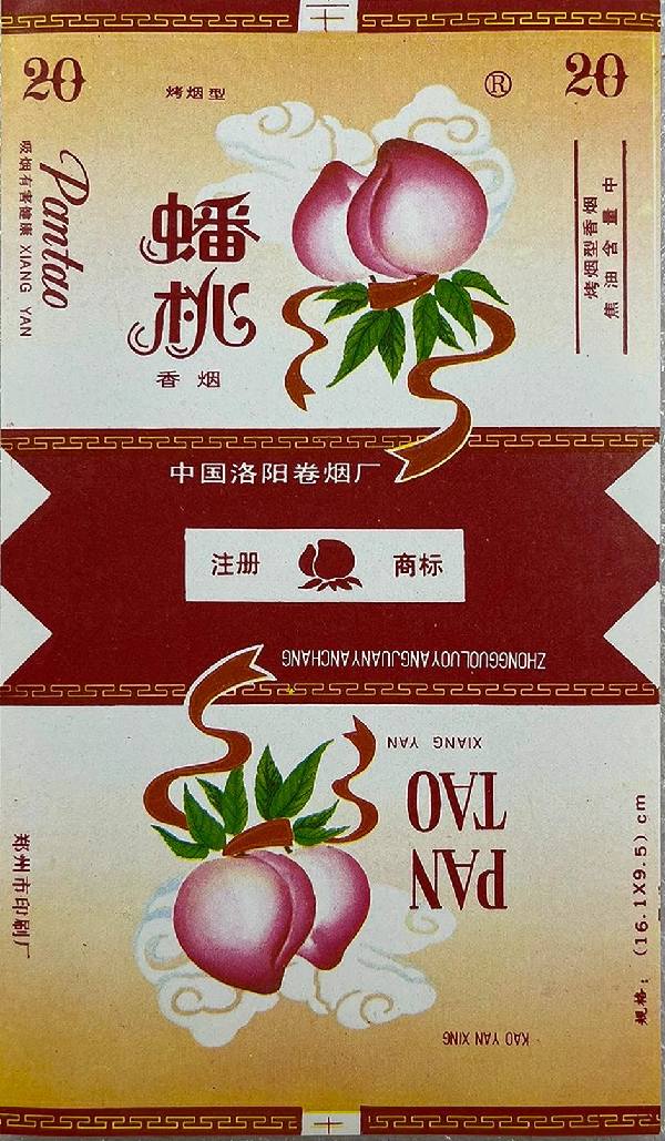 上世紀80年代,中國洛陽卷煙廠出品“蟠桃”卷煙。其煙標主副圖案都繪有粉嫩飽滿的蟠桃,搭配翠綠葉片與飄動的棕色絲帶,背景襯以祥云紋,營造出良好的視覺效果。